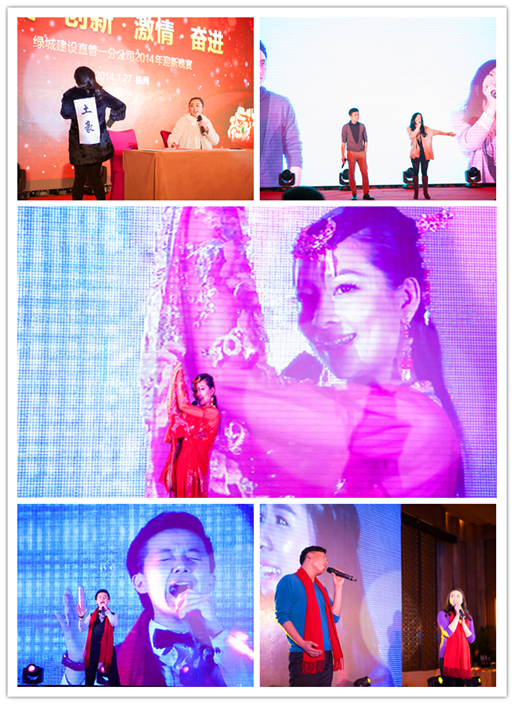 接着,晚宴在绿城•建德春江明月选送的《中国范儿》开场舞的祝福声中拉开节目帷幕。绿城宝业•绍兴玉园孙丙寅和绿城•杭州元福里戴珣、陈妍带来的《她来听我的演唱会》和《爱要坦荡荡》展示了年轻员工对爱的真诚和坦然以及对生活的热情;互动节目《2013经典影片方言配音》更是诠释了家乡方言的魅力;绿城•杭州蘭园梁一波和王懿霏带来的歌曲《存在》透射出年轻员工不甘过平庸的生活,让青春绽放更多的光芒,让自己的人生更加精彩的激情;绿城•杭州玉园卢璐和胡文琴带来的《马上有钱》汇集了绿城营销人员的工作写照,也凝聚了无数营销人的智慧结晶,只要入住绿城房就是一切美好和幸福的开始;绿城•杭州西溪诚园顾青带来的歌舞《贞观长歌》演绎出了古典歌舞的魅力;绿城•杭州蓝庭孙方秋带来的《酒醉的探戈》更是将整个会场气氛推向高潮,活力四射、激情永续,迎来在座宾客的阵阵掌声和呐喊声;绿城•杭州星桥紫桂公寓选送的《高原蓝》展示了食堂阿姨的天籁之音。最后,晚宴在绿城建设许峰总裁和全体演职人员共同演绎的《飞得更高》的美好祝愿下顺利拉下帷幕。